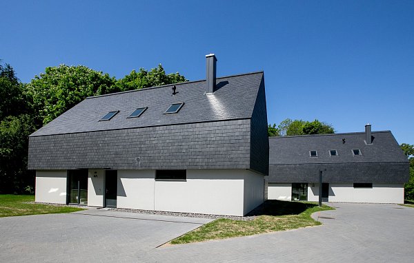 В экстерьере сланцевая плитка используется для мощения дорожек, облицовки фасадов и создания декоративных элементов. Её устойчивость к атмосферным воздействиям делает её идеальным материалом для наружных работ.